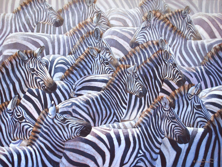 Synergy is the interaction or cooperation of two or more organizations, substances, or other agents to produce a combined effect greater than the sum of their separate effects. I thought it was a perfect name as the herd of zebras combined produce an electric energy that is exciting and stimulating! A Limited Edition, Framed Canvas Print from wildlife artist James Corwin.