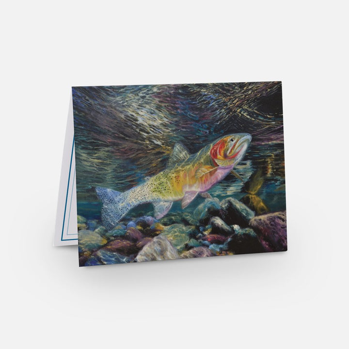 A cutthroat trout shows off its rainbow colors swimming in a shimmering stream.
