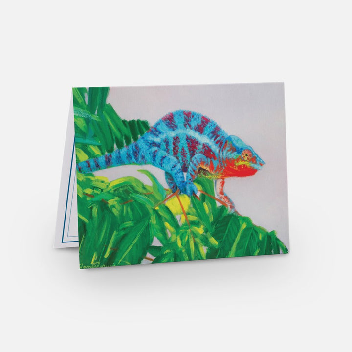 A chameleon stalks along green leaves while taking on electric blue and red coloring.