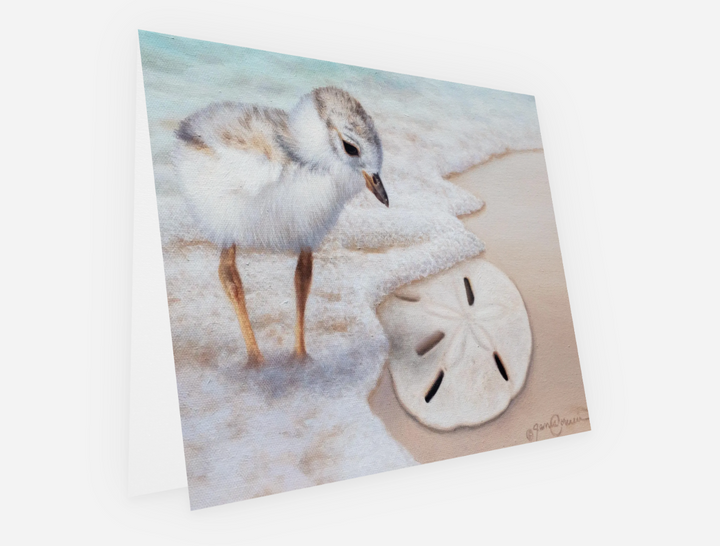 A fledgling plover curiously observes a sand dollar it found on the beach.