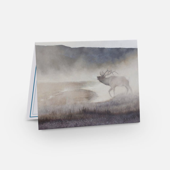 In the misty morning, a bull elk calls out over a frost-tipped meadow.