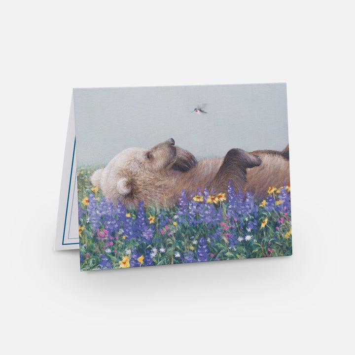 A grizzly bear considers a nearby hummingbird while laying in a field of wildflowers.
