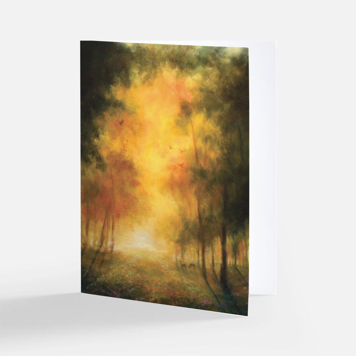 Sunrise emerges through a forest, illuminating fall-colored leaves.