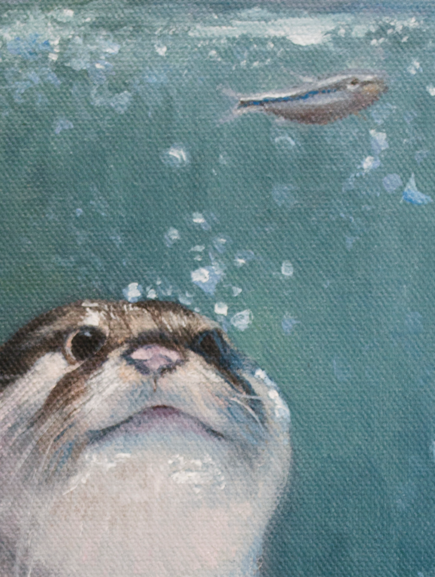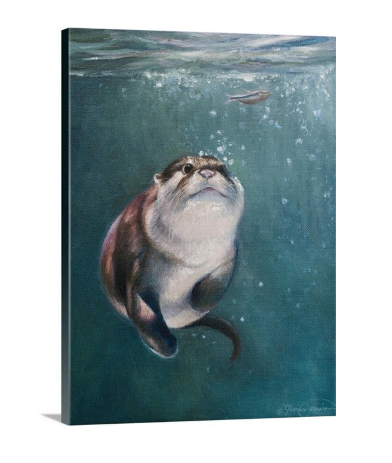 Ein niedlicher molliger Flussotter gleitet unter Wasser, um seine nächste Mahlzeit zu fangen, eine glänzende Elritze. Dieses Gemälde ist jetzt in einer Limited Edition von 25.