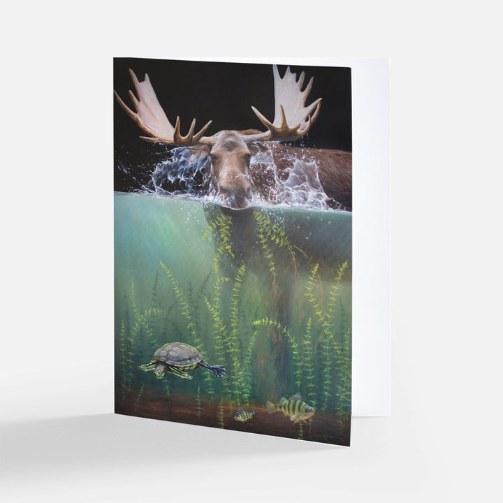 A bull moose wades through green-blue water, aquatic wildlife swimming underneath.
