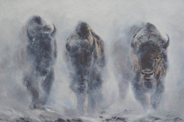 One of my most famous paintings. Bison in Yellowstone National Park often huddle around hot geyser mist/steam during the winter to keep warm. The ice and snow begins to build of their fur creating large snowy ghosts.