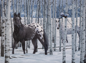 Chargement de l'image: A canvas print featuring two great blue herons in an elegant pose, building a nest with detailed feathering and a contemporary background by wildlife artist James Corwin oil painting.